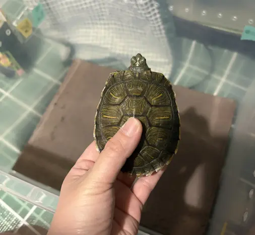 首に赤い色が入っている子です。尾が少し切れている個体ですが、現在は元気で食欲もあり、体調は安定しています。現在は、レプトミン(大粒)カメプロス、DCM亀の餌(大粒)、飼育教材(小粒)をすべてミックスして与えています。